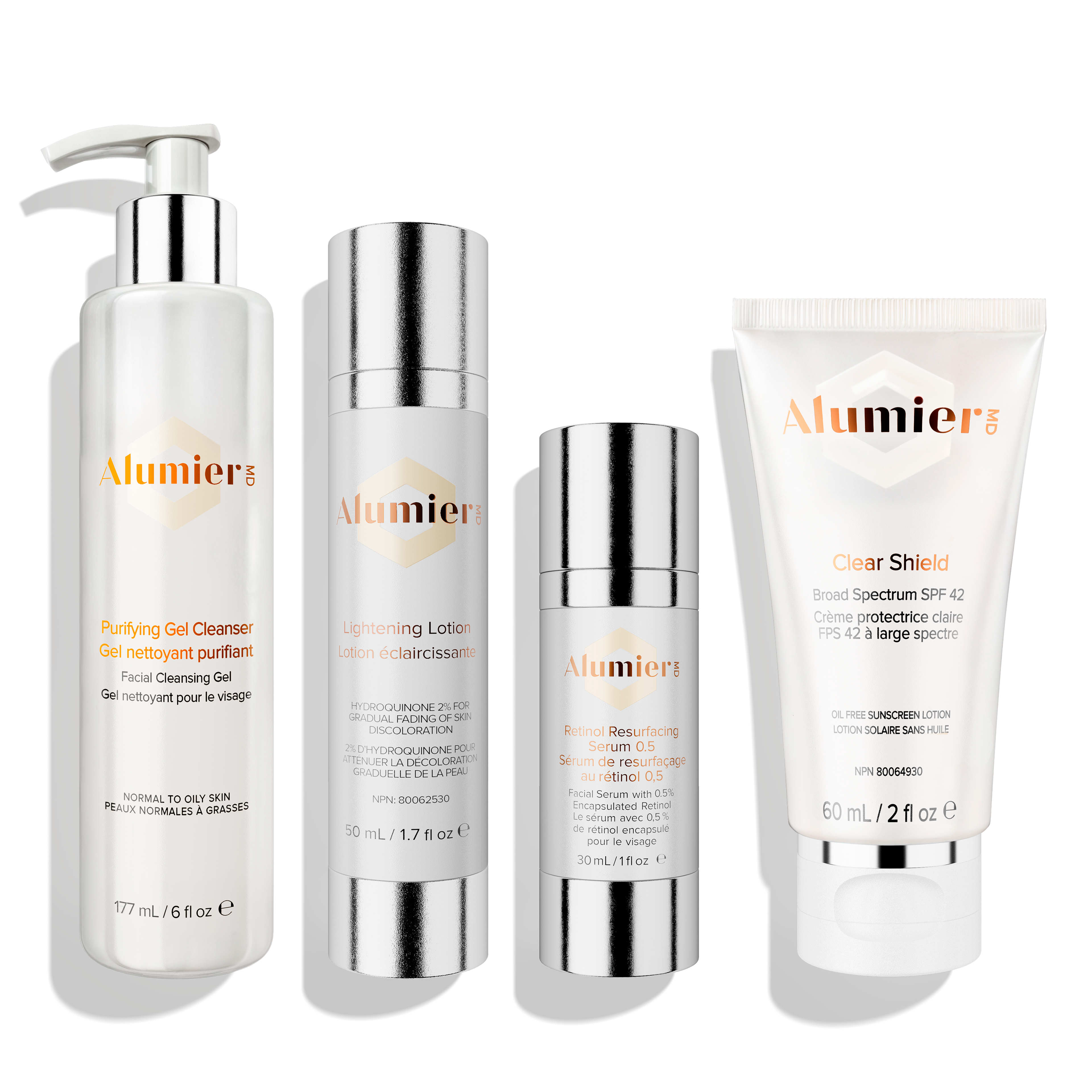 Reveal radiant, even-toned skin with the AlumierMD™ Brightening Collection for Hyperpigmentation for normal and oily skin. Specifically designed for normal and oily skin types, this comprehensive kit combines clinically proven ingredients to target hyperpigmentation while simultaneously soothing and nourishing the skin.