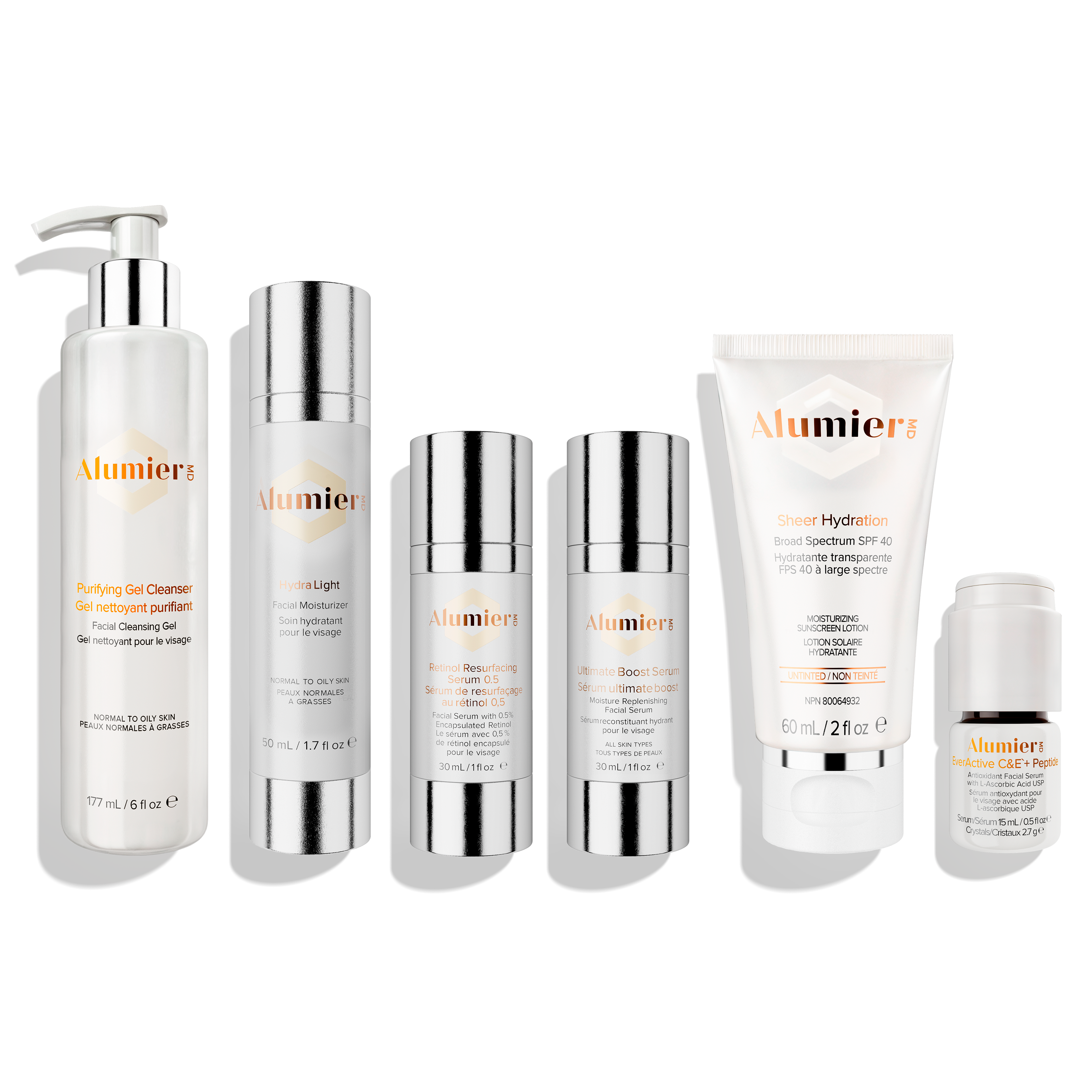 Step 1: Cleanse with HydraBoost Cleanser morning and evening. Step 2: Apply EverActive C&E™ + Peptide after cleansing for antioxidant protection. Step 3: Gently apply Ultimate Boost Serum to hydrate the skin. Step 4: Follow with HydraDew Moisturizer to lock in hydration. Step 5: Finish with Sheer Hydration SPF 40 every morning for daily sun protection. Step 6: Apply Retinol Resurfacing Serum 0.5 2-3 times a week at night. Optional: Reapply SPF as needed throughout the day.