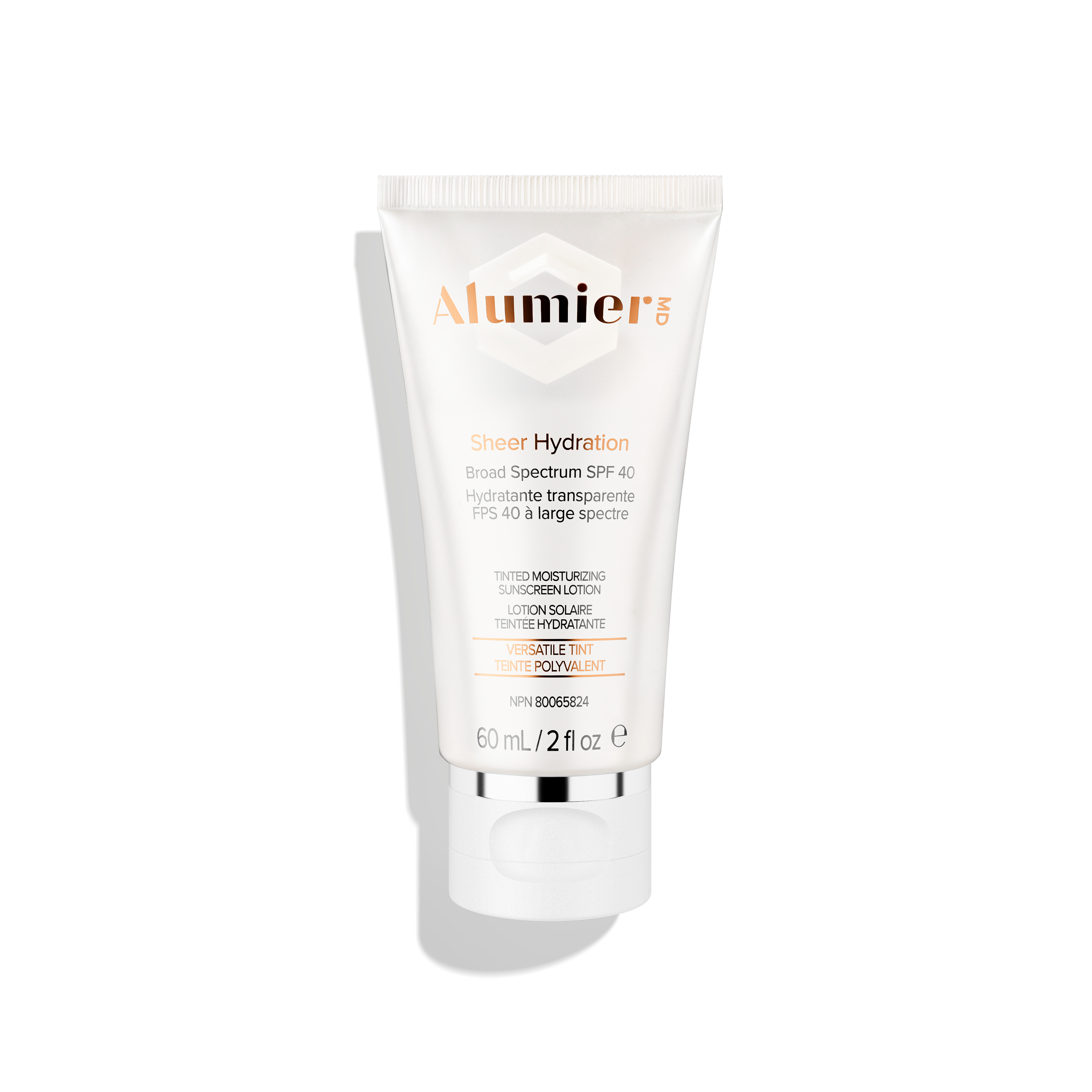 Experience radiant skin that’s protected, hydrated, and flawlessly enhanced with AlumierMD™ Sheer Hydration Broad Spectrum Sunscreen SPF 40 Versatile Tint.